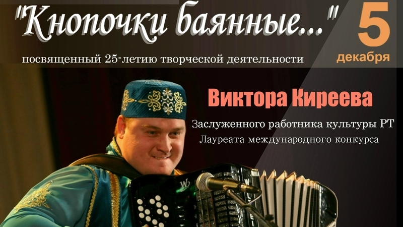 5 нче декабрьдә 17 сәгатьтә Балалар сәнгать йортының актлар залындаТР ның атказангансәнгатҗ хезмәткәре Виктор Киреевның иҗатына 25 ел тулуга багышланган “Баян телләре” дип аталган концерт булачак.