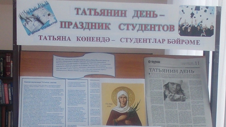 Бу бәйрәмгә район үзәк китапханәсендә «Татьяна көне – студентлар бәйрәме»дип исемләнгән китап күргәзмәсе оештырылды. Күргәзмәдә Татьянаның Изге мучениесен искә алу көнен бәйрәм итү турындагы китаплар, аларның төп героинясы-Татьяна, һәм әлбәттә инде, аларның авторлары Татьяна Устинова һәм Татьяна Полякова, Татьяна Толстойның китапларына ихтыяҗ зур булган китаплары урын алды. Шулай ук студентлар көнен бәйрәм итү тарихы һәм традицияләре, уңышлы карьера ясау турында сөйләүче китаплар да бар.