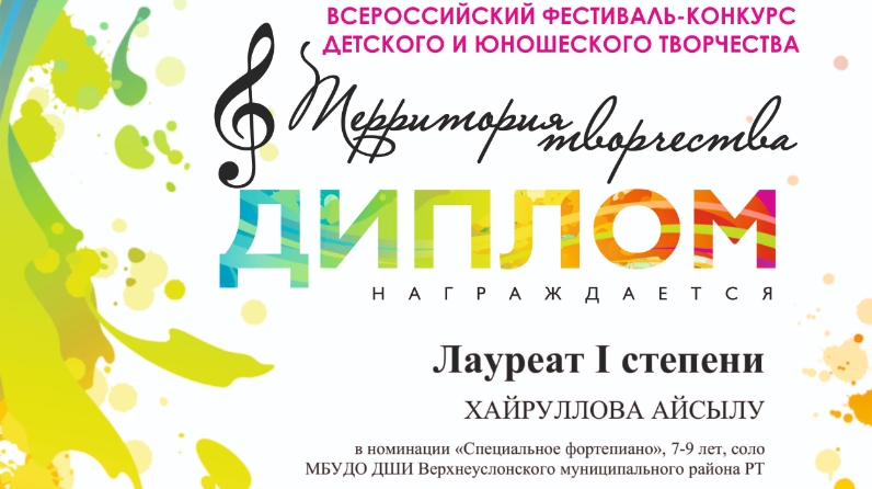 Катлаулы хәлләргә карамастан, безнең укучылар үзләрен күрсәтү юлларын табалар. Махсус фортепиано мәктәбенең 1 сыйныф укучысы Айсылу Хәйруллова (укытучысы Т.В. Егорихина), 2020 елның 6 апрелендә «Иҗат территориясе» Бөтенроссия конкурсында катнашты.