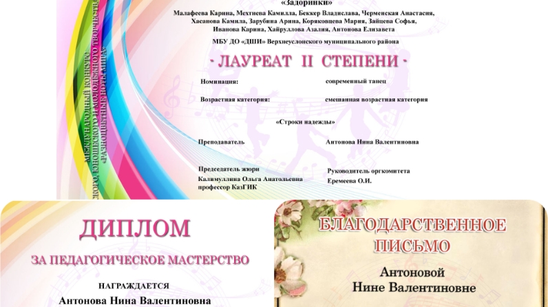 13 апрельдән 19 апрельгә кадәр Ростов-Дон шәһәрендә «Дөньяның төрле төстәге ноталары» Халыкара балалар, яшүсмерләр һәм яшьләр иҗаты конкурсы узды. Ай дәвамында без нәтиҗәләребезне көттек һәм менә 11 май көнне компетентлы жюри карары буенча Югары Ослан коллективы чыгышын югары бәяләде. «Задоринки» хореографик төркеме катнаш яшь категориясендә «Заманча бию» номинациясендә «Өмет Строклары» биюе белән II дәрәҗә лауреат дипломына лаек булды.