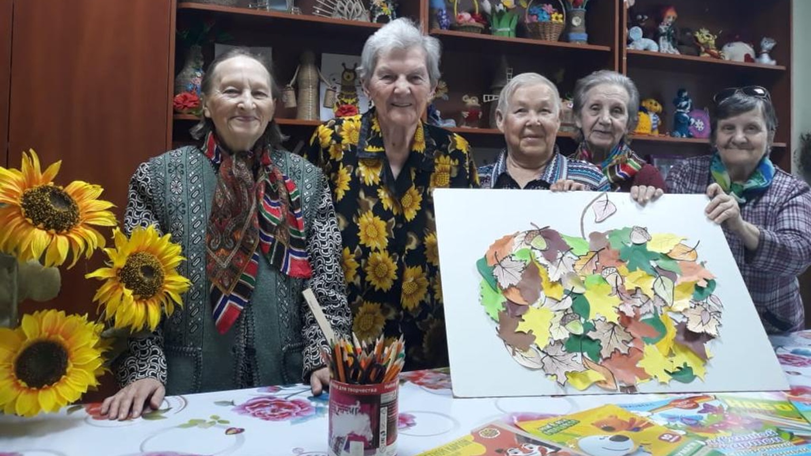 Хезмәт буенча инструктор Наталья Котова җитәкчелегендә "иҗат шатлыгы" түгәрәгендә катнашучылар шаблоннар алдылар, кәгазь төсен сайладылар һәм анда яфраклар эзләделәр. Якты, төсле эшләнмәләр килеп чыкты. Зур панельгә алма схемасын ясадылар һәм аның күләме буенча бөтен листовкаларын ябыштыра башладылар.