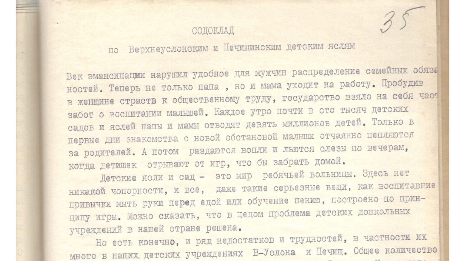 Мәсәлән, Югары Ослан авыл Советы башкарма комитеты утырышының 1971 елның 29 июнендәге беркетмәсен ачып, без көн тәртибендә «авыл Советы бюджетында торучы балалар мәктәпкәчә оешмалары эше турында»дигән тема күрәбез.