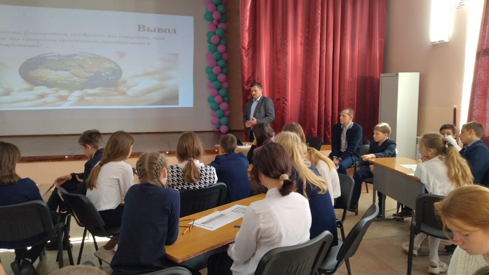 Анна Дмитриевна 5-9 сыйныф укучылары белән хокук бозу, бозыклык, җинаять, җаваплылык төрләре, җәза турында сөйләште. Катнашучылар алган белемнәр нигезендә төрле хокукый бурычларны тикшерделәр.