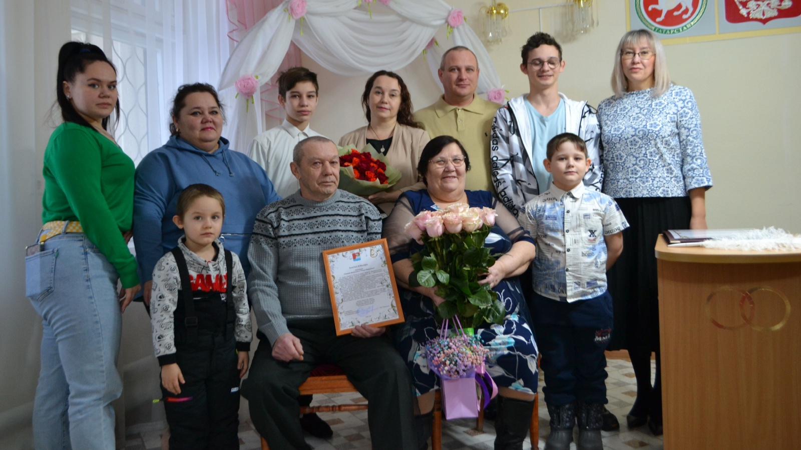 Бергә яшәүнең 50 еллыгы уңаеннан Мельниковлар гаиләсенең исемнәре «Районның гаилә тормышының мактаулы юбилярлары» китабына кертелде. ЗАГС бүлеге начальнигы Наталья Кадыйрова юбилярларга сәламәтлек, иминлек, тынычлык һәм тагын да озын гомер теләп Югары Ослан муниципаль районы башлыгы Марат Зиатдиновның Рәхмәт хатын һәм истәлекле бүләген тапшырды. Юбилярларга балаларыннан, оныклары һәм якыннарыннан бик күп җылы сүзләр әйтелде.