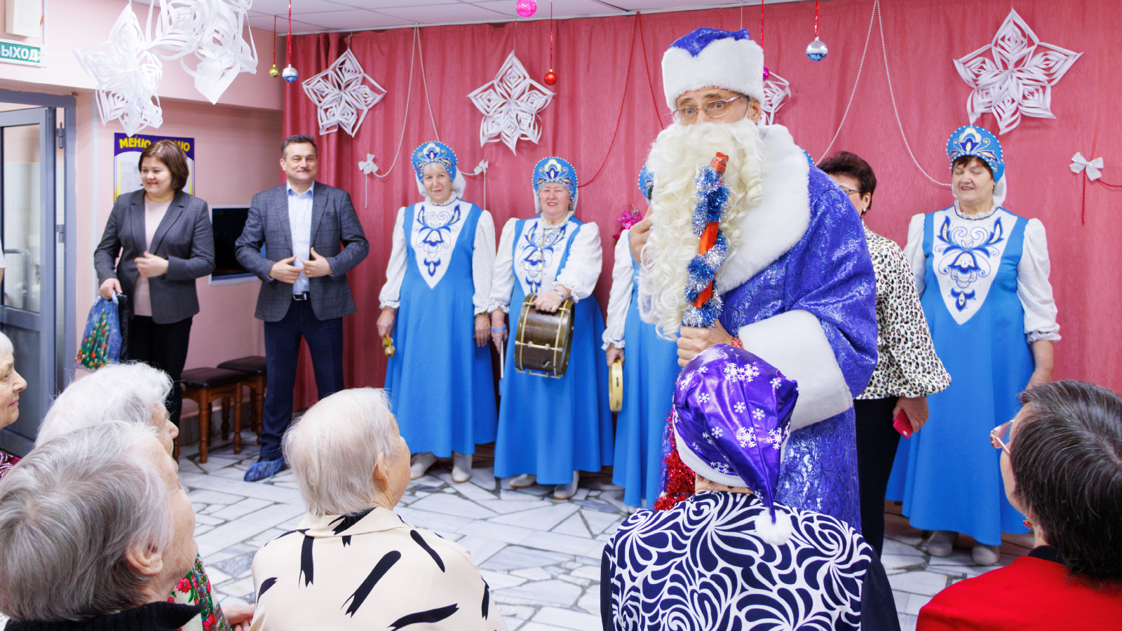 Иске традиция буенча ул җыелганнарга иң яхшы сүзләр әйтте һәм социаль хезмәтләр алучыларга татлы Яңа ел бүләкләре һәм зур яңа ел тортлары тапшырды. Социаль яклау бүлеге башлыгы Алина Матвеева да якынлашып килүче бәйрәм белән котлады, Казанның 19 нчы гимназиясе укучылары ясаган конфетлар салынган яңа ел капчыгы һәм төсле открыткалар бүләк итте. Оешма коллективын һәм социаль хезмәтләр алучыларны котларга район башкарма комитетының социаль-мәдәни мәсьәләләр буенча җитәкче урынбасары Ирина Алеева да килде. Интернат директоры Танзилә Васильева, үз чиратында, барысына да нык сәламәтлек, яхшы кәеф, тынычлык һәм игелек теләде.