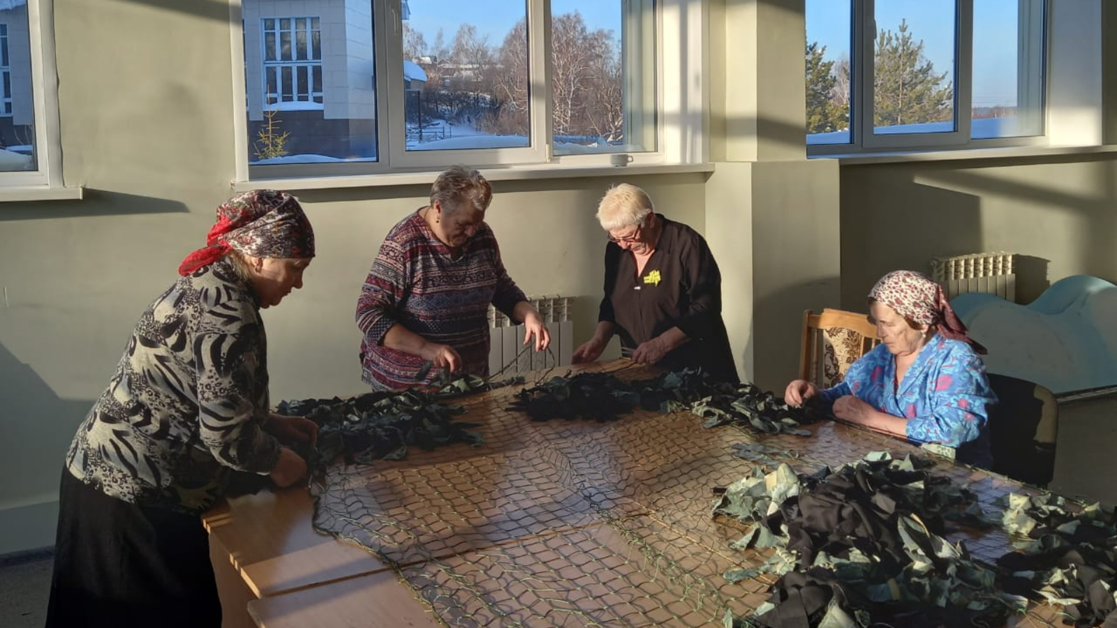 Бүген Югары Ослан авылының Яшьләр клубында балалар маскировка челтәрләре үреп, яндыру һәм окоп шәмнәре ясыйлар. Ә алар янында аларның остазлары, .иләре .