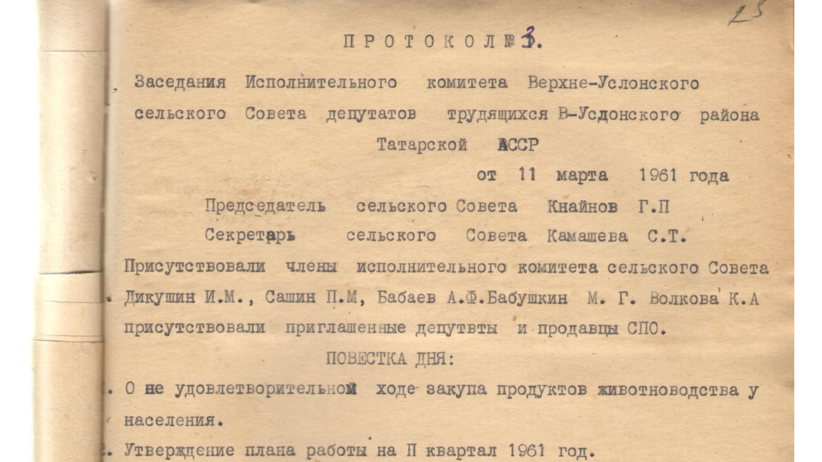 Хезмәтчәннәр депутатларының Югары Ослан авыл Советы Башкарма комитеты утырышының 1961 елның 11 мартындагы протоколы белән танышырга тәкъдим итәбез.