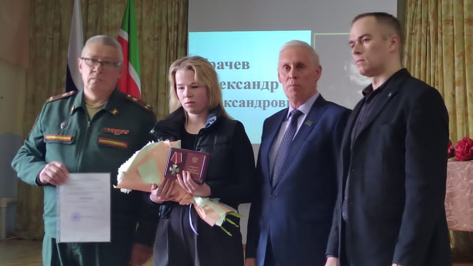 16 апрельдә махсус хәрби операция барышында һәлак булган Александр Грачевның туганнарына Батырлык ордены тапшыру уңаеннан хәтер кичәсе узды.
