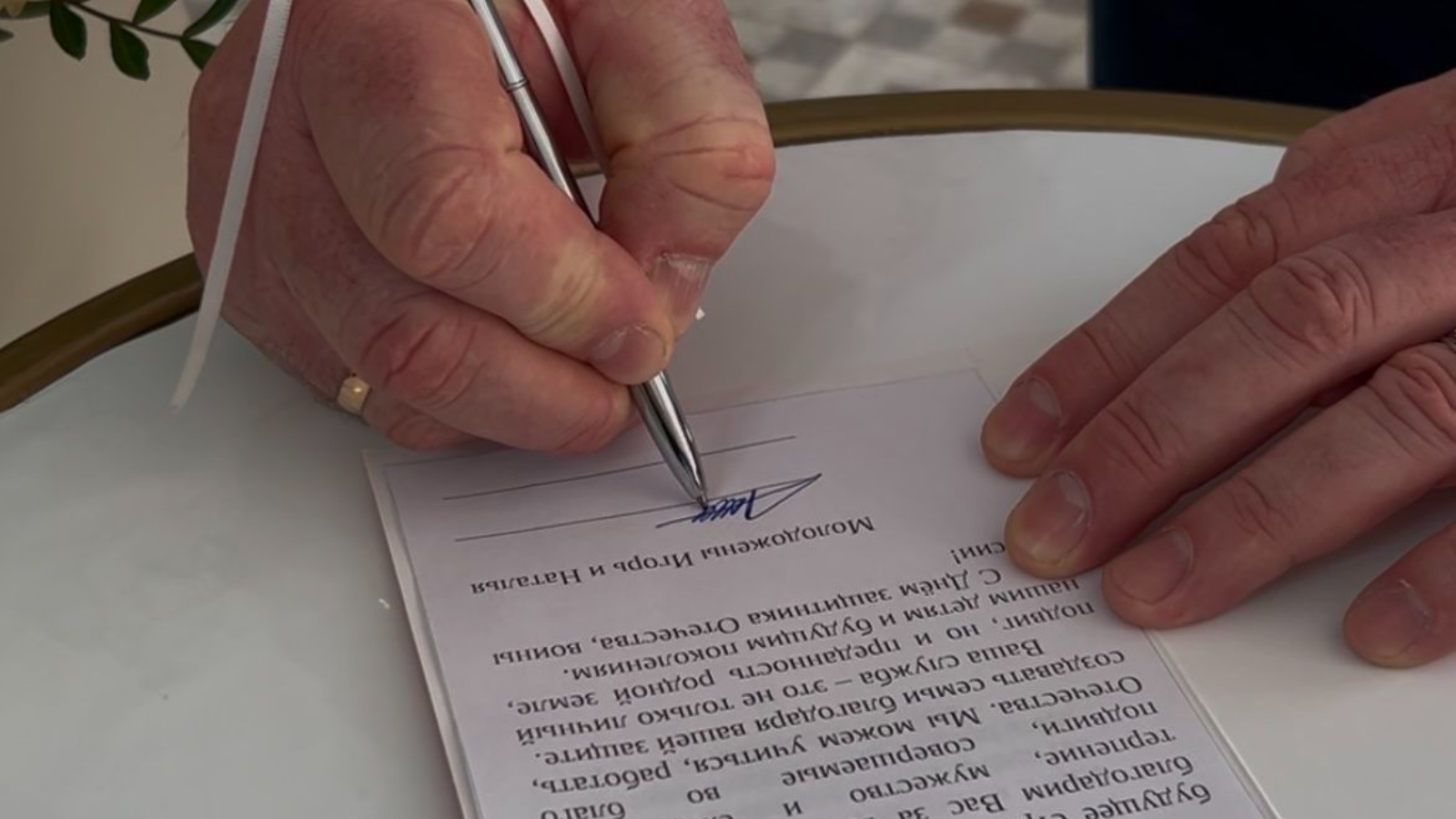 Никахлашуны теркәү көнендә катнашучыларга рәхмәт сүзләре язылган котлау открыткасына үзебез кул куйдык.