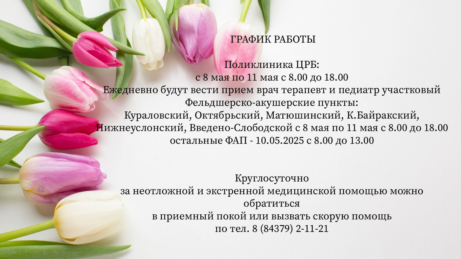Куралово, октябрь, Матюшино, к. Байрак, Түбән Ослан, Введенск Бистәсе районнары 8 майдан 11 майга кадәр 8.00 сәгатьтән 18.00 сәгатькә кадәр калганнары ФАП - 10.05.2025 8.00 дән 13.00 гә кадәр у тәүлек буе ашыгыч һәм