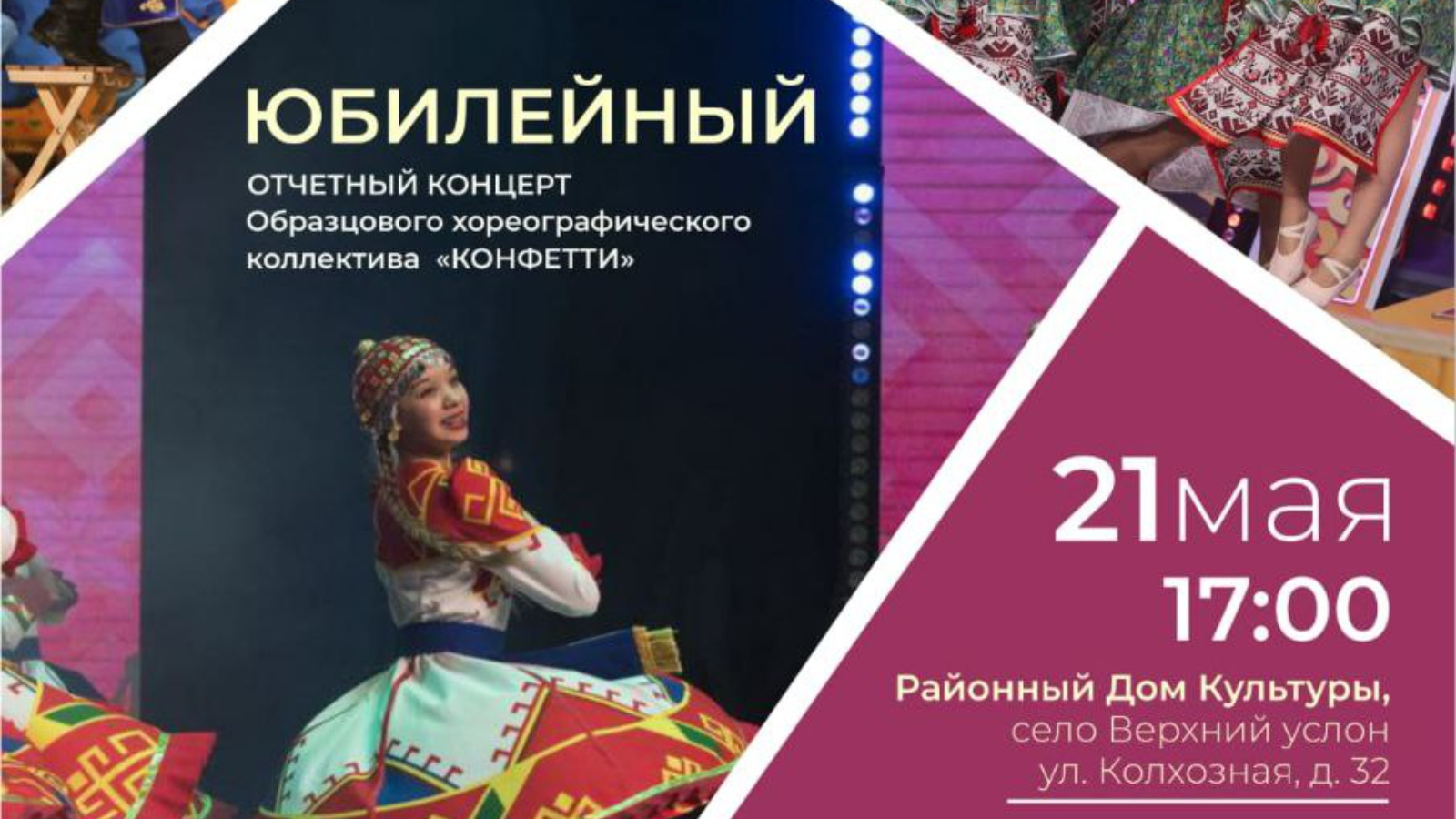 2025 елның 21 маенда 17:00 сәгатьтә барысын да район мәдәният йортына Нина Антонова һәм Гөлнара Ашарапова җитәкчелегендәге үрнәк "Конфетти" үзешчән коллективы "Беренче адымнан аплодисментларга - 10 ел!" хореография бүлегенең юбилей отчет концертына чакыра.