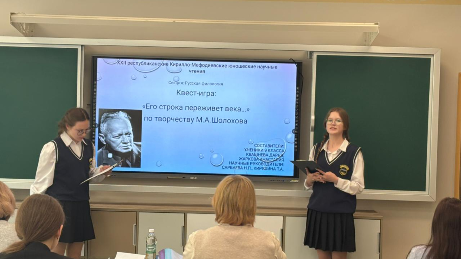 Тугызынчы сыйныф укучылары Дарья Квашнева һәм Анастасия Жаркова «Рус филологиясе»секциясендә эшләүләре белән аерылып тордылар. Алар тарафыннан эшләнгән «строк его переживет века» квест-уены танылган совет язучысы Михаил Александрович Шолоховның тормышына һәм иҗатына багышланган иде.Укучылар һәм жюри әгъзалары үзләренең белемнәрен тикшереп, «Тын Дон» романы геройлары дөньясы һәм автор хикәяләре белән танышып, уен программасында актив катнаштылар.