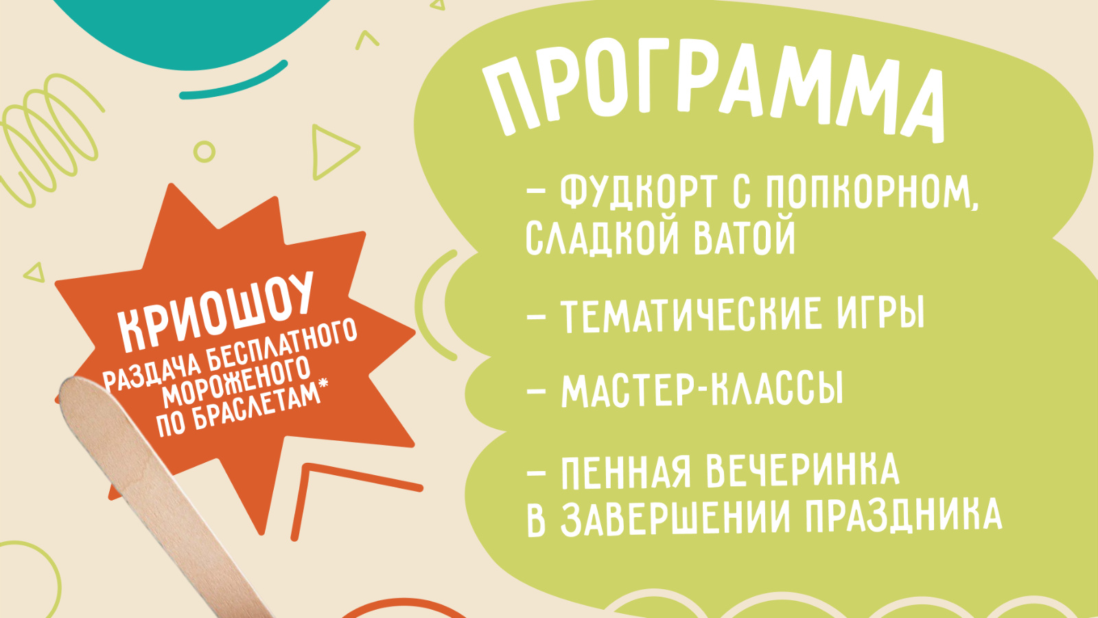 Бәйрәмнең кульминациясе "Криошоу" булачак - махсус беләзекләр буенча бушлай туңдырма өләшү. Туңдырма күләме чикләнгән, шуңа күрә оештыручылар үз порцияләрен ашыктырырга киңәш итә.