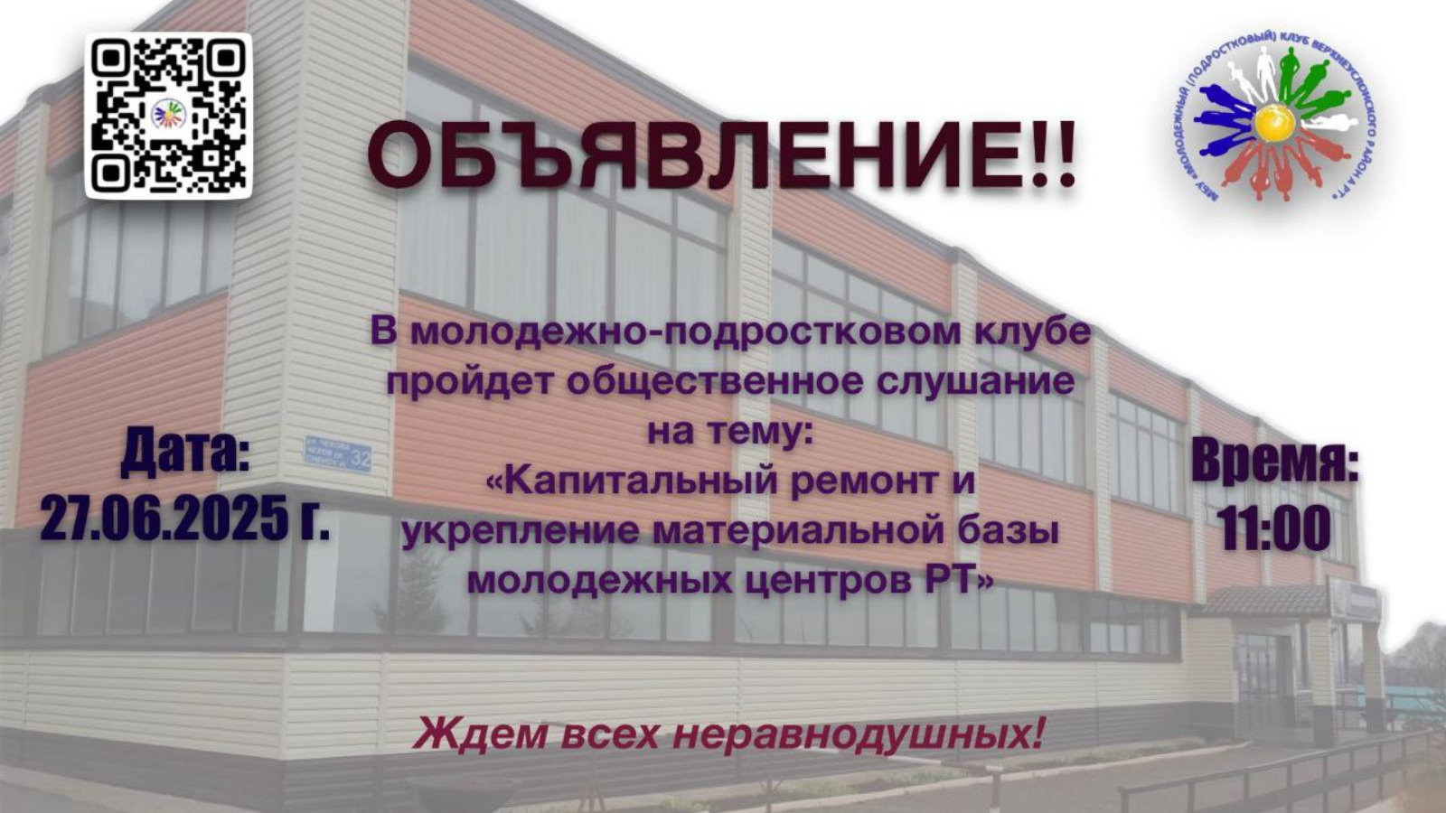 Яшьләр-яшүсмерләр клубында <ТР яшьләр үзәкләренең матди базасын капиталь ремонтлау һәм ныгыту>темасына җәмәгать тыңлаулары узачак