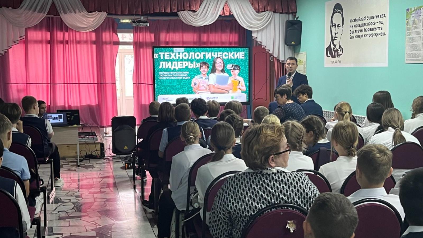 «Иннополис лицее» дәүләт мәгариф учреждениесенең 10 – 11 сыйныф укучылары: Логинов Сергей, Каржавин Егор, Проскуряков Ярослав һәм Миркасимов Илназ, шулай ук аларның җитәкчеләре Михаил Леонидович Михайлов гимназия укучыларына «Технологик лидерлар» уйлап табучы мәсьәләләрен чишү буенча Татарстан беренчелегендә катнашу мөмкинлекләре турында сөйләргә килделәр.