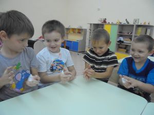 Тәрбияче Татьяна Гудихина балалар белән кар белән капланган агачлар күреп керделәр. Озак та уйламыча пластилин һәм мамык ярдәмендә “Кышкы агачлар” ясарга булдылар.