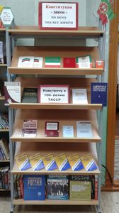 “Конституция - законнар тупламасы, шуңа таянып яшибез”, нэкъ шул исемдә Татарстан Конституиясе көне уңаеннан, ТАССРның 100 –еллык юбилеена багышланган китап күргәзмәсе Рус Макылы авыл китапханәсендә үзенең эшен башлап җибәрде һәм китап сөюче дусларын көтеп кала. Инде өлкән буын вәкилләре күргәзмә белән танышып фикер алыштылар.
