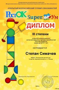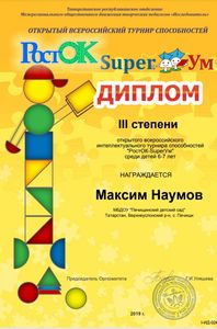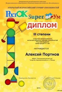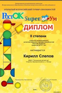 Югары Ослан районының Печище авылының балалар бакчасына йөрүче өлкәннәр төркеме 22нче октябрьдән 25нче октябрьгә тикле"РостОК" Бөтенрәсәй сәләтлелек турнирында катнаштылар. Турнир алты биремнән торды. "ЧУДО-ДЕРЕВО"- кыска вакытлы хәтерне тикшерде, "ТАНИН МАГАЗИН"- үзгәргән шартларда кайбер фигураларның эзлеклелеген билгели белү иде." ПОСТРОЙКИ- бөтен өлешне аерып чыгара белү, объектларда урнашкан объектлар арасында катлаулы булмаган бәйләнешләр һәм мөнәсәбәтләр урнаштыра белү. "КРЕСТИКИ-НОЛИКИ" уены - игътибарны бүтәннәргә юнәлтергә, аны башта бер обьекттан икенчесенә күчерергә, күзәнәк кырында ориентлашырга белү иде. "ПРЕВРАЩЕНИЯ"- хыялның сәләтен ачыклау, бирелгән фигураларны яңа образлар булдыру өчен куллана белү. "ФИГУРЫ"- тирә- юньдәге предметларның торышын, схемаларны укый белү осталыгына багышланган биремнәр иде. Балалар биремнәрне мавыгып башкардылар, ләкин биремнәрдә кайбер кыенлыклар да очрады. Һәм менә нәтиҗә.