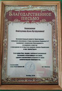 «Бакча- Сарай авылы клубы”мөдире һәм Югары Ослан район Советы депутаты Асия Файзулова 25нче ноябрь көнне Югары Ослан район Советы 4нче чакырылышының 3нче утырышы эшендә катнашты.