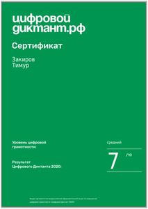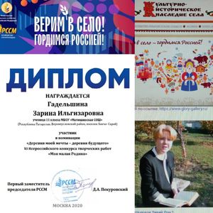 «Минем кече Ватаным» XI Бөтенроссия иҗат эшләре конкурсы дипломы белән Матюшино китапханәсе укучысы Гадельшина Зарина бүләкләнде.