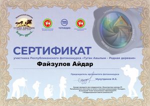ТАССРның 100еллыгына һәм “Туган авылым” комплексына 15 ел булу кысаларында игълан ителгән Республикакүләм “Туган авылым – Родная деревня” фоторәсем бәйгесендә “Татарстан авылы.Бәйрәмнәр” номинациясендә катнашкан авылдашыбыз Айдар Файзулов Сертификат белән бүләкләнде.Бәйгегә татар халкының “Карга боткасы” бәйрәменнән фотосүрәтләр җибәрелгән иде.