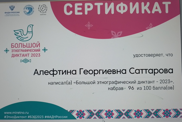 8 ноябрьдә Мәмәтхуҗа авылы мәдәният йорты мөдире Алефтина Саттарова 2023 елның 3-8 ноябрендә “Зур этнографик диктант” халыкара акциясендә катнашты. Зур этнографик диктант - Россиядә яшәүче халыклар мәдәнияте белән таныштыручы агарту проекты, шулай ук этномәдәни белемнең гомуми дәрәҗәсен бәяләргә мөмкинлек бирә. Акцияне оештыручы - милләтләр эшләре буенча федераль агентлык. Диктантның биремнәре тест рәвешендә рәсмиләштерелгән. Тест 30 сораудан тора.