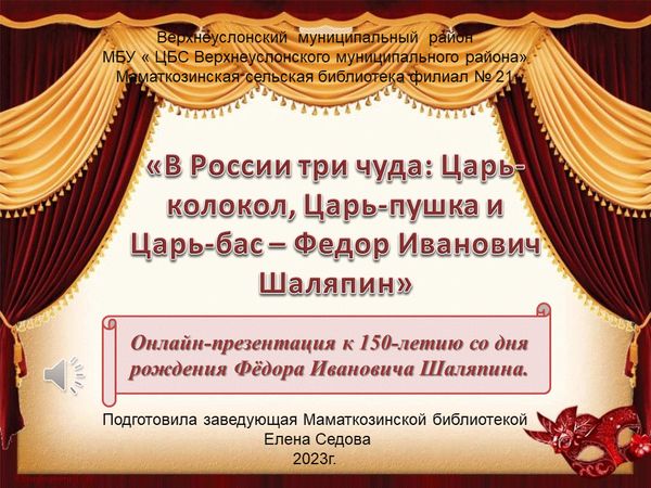 13 февральдә Мәмәтхуҗа авыл китапханәсе сезнең игътибарыгызга бөек рус опера һәм камера җырчысы, Россия Совет Федератив Социалистик Республикасының халык артисты Федор Иванович Шаляпинның тууына 150 ел тулуга багышланган «Россиядә-өч могҗиза: патша - колокол, патша-пушка һәм патша-бас-Федор Иванович Шаляпин» онлайн - презентациясен тәкъдим итте. Онлайн-презентация мастерның биографиясе һәм катлаулы иҗади юлы белән таныштыра, аның барышында Федор Шаляпин статисттан дөнья күләмендәге җырчыга әверелә. Киң таралган күзлектән караганда, Шаляпин үзенең популярлыгын җырчы кебек түгел, ә танылган артист, реинкарнация һәм нәфис сүз остасы кебек яулаган. Шаляпин һәр опера образын җырчы буларак кына түгел, актер һәм режиссер буларак та төзегән. Шаляпинның биографиясе беркемне дә битараф калдырмый, ул бернәрсәгә дә карамастан үз максатына омтылучы кешенең ачык мисалы.