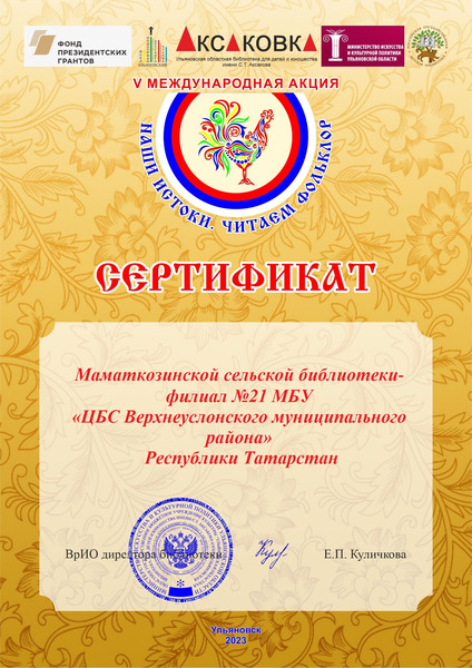 Мәмәтхуҗа авыл китапханәсе сертификат белән бүләкләнде. Акцияне «С.Т.Аксаков исемендәге балалар һәм яшүсмерләр өчен Ульяновск өлкә китапханәсе»Өлкә дәүләт бюджет мәдәният учреждениесе оештырды. Акциянең максаты булып яшь буында фольклорны өйрәнү һәм популярлаштыру аша төрле халыклар, мәдәниятләр, ышанулар вәкилләренә карата ихтирам һәм игелек формалаштыру һәм үстерү тора.