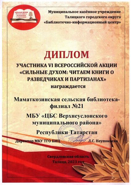 Бөек Ватан сугышы елларында совет разведчиклары, партизаннар һәм подпольщиклар батырлыгына багышланган «Көчле рухлылар: разведчиклар һәм партизаннар турында китаплар укыйбыз» Бөтенроссия акциясендә катнашкан өчен Мәмәтхуҗа авыл китапханәсе акциядә катнашучы дипломы белән бүләкләнде. Әлеге акцияне оештыручы-Талицк шәһәр округы МКУ " китапханә-мәгълүмат үзәге». Акциянең максаты: илебезнең героик үткәне, күренекле шәхесләр биографиясе мисалында гражданнарны тарихи-патриотик тәрбияләүгә ярдәм итү. Бөек Ватан сугышы турында әсәрләрне төрле яшьтәге укучылар арасында популярлаштыру.