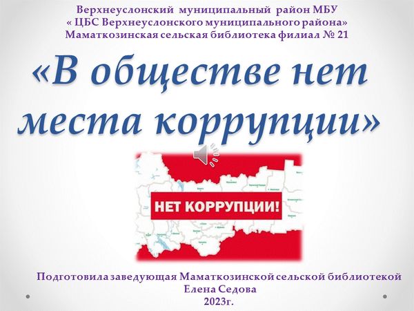 7 декабрьдә Мәмәтхуҗа авылы мәдәният йортында Халыкара коррупциягә каршы көрәш көненә "Власть, коррупция, намуслылык" дигән мәгълүмат сәгате узды. Хәзерге вакытта коррупциягә каршы көрәш мәсьәләләренә хакимиятнең үзәк органнары тарафыннан да, җирле үзидарә органнары тарафыннан да зур игътибар бирелә. Коррупциягә каршы көрәш бурычы бик катлаулы. Аңа күп санлы мәкаләләр һәм әйдәп баручы галимнәрнең, дәүләт һәм хөкүмәт җитәкчеләренең чыгышлары багышланган. Коррупция Россия Президенты тарафыннан милли иминлеккә куркыныч янаучы төп чыганакларның берсе дип аталган. Бу илнең икътисадый һәм сәяси үсеше өчен иң җитди киртәләрнең берсе. Алефтина Саттарова катнашучыларга коррупциянең нәрсә булуын, кайда очравын сөйләде. Шулай ук балалар "ришвәт алу" һәм "ришвәт бирү" турында да белделәр - бу начар, барлык мәсьәләләрне дә хәл итәргә кирәк, законны читләтеп үтмичә һәм үз алдыңда һәм башка кешеләр алдында намуслы булырга кирәк.