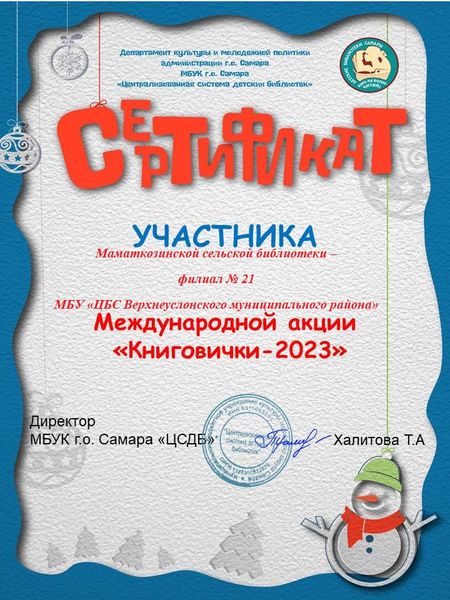 Тоталь уку онлайн-акциясендә катнашкан өчен «ЛИРАТУРНОЕ ПУТЕШЕСТВИЕ, НЕ ВЫХОДЯ ИЗ ДОМА» яшьләр китапханә фестивале кысаларында узган «БиблиоФест» яшьләр китапханә фестивале кысаларында Маматкозино авыл китапханәсе мөдире Елена Седова катнашучы сертификаты алды. Акциянең шигаре – «Дивандан тормастан, төрле илләрнең әдәбияты дөньясына чумыгыз». Катнашу өчен хыял илен сайларга һәм аның турында һәм аның иң якты әдәби вәкилләре турында 2-3 минутка кечкенә видеороликта сөйләргә кирәк иде. Елена Жюль Вернның «Җир үзәгенә сәяхәт» исемле фантастикасы һәм маҗаралары серле дөньясына тәкъдим итте һәм яшьләрне аның китапларын укырга чакырды.