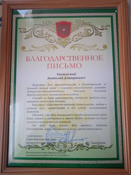 18 гыйнварда Яңа Рус Мәмәтхуҗасы авыл җирлегендә гражданнар җыены булды, анда район башлыгы урынбасары Сергей Осянин Яңа Рус Мәмәтхуҗасы авыл җирлегенең социаль-икътисади үсешенә шәхси өлеш керткәне, актив тормыш позициясе, туган авылга мәхәббәт һәм аның язмышына битараф булмаганы өчен Анатолий Дмитриевич Югары Ослан районы Башлыгының Рәхмәт хаты белән бүләкләде. Анатолий Дмитриевичка чын күңелдән сәламәтлек, бәхет, иминлек, күңел көрлеге, озын гомер, уңышлар һәм бетмәс-төкәнмәс тормыш энергиясе телибез! Сезгә барлык башлангычларда уңышлар, тынычлык һәм игелек телибез!
