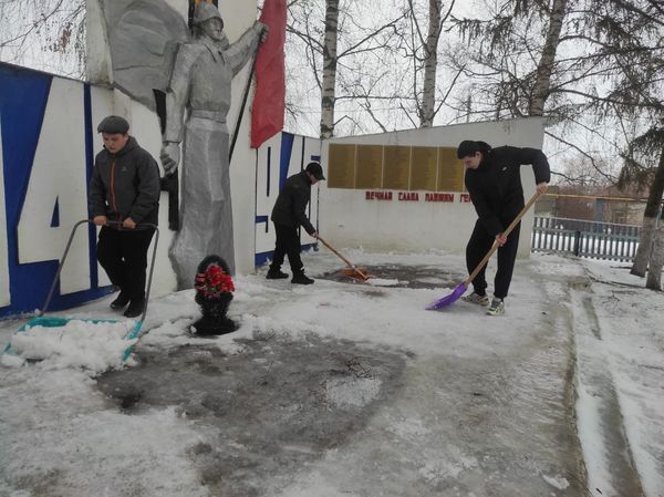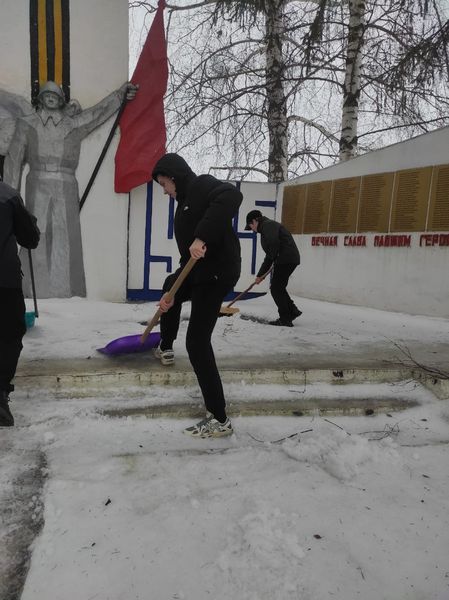 Олы Мәми урта гомуми белем бирү мәктәбе укучылары, кар яуганнан соң, Бөек Ватан сугышында һәлак булган сугышчы-якташларына куелган һәйкәл янын җыештыруны оештырдылар.
