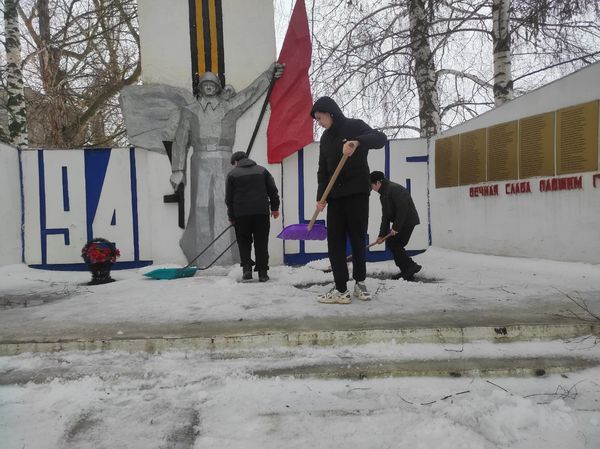 Балалар һәйкәлгә юлны чистарттылар, мәйданчыкта кар җыештырдылар, мемориаль плитәне чистарттылар, чәчәкләрне төзәттеләр.