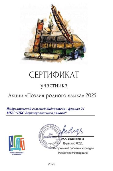 Ямбулат авыл китапханәсе Халыкара туган тел көненә багышланган Россия дәүләт балалар китапханәсе оештырган «Туган тел поэзиясе» акциясенә кушылды. «Туган тел поэзиясе» акциясе Россия халыкларының мәдәни мирасын саклап калырга һәм тапшырырга ярдәм итә. Ул тел һәм мәдәни күптөрлелекне ныгытуга ярдәм итә, шулай ук балаларны һәм яшүсмерләрне туган телләрен өйрәнүгә һәм көндәлек тормышта куллануга рухландыра. Акциядә Коргуза урта мәктәбенең 4 класс укучысы Әхмәтҗанова Сөембикә 10 яшьлек катнашты, Муса Җәлилнең «Имән» шигырен татар телендә укыды.