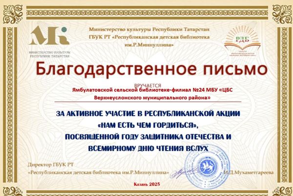 Ямбулат авыл китапханәсе Ватанны саклаучылар елына һәм Бөтендөнья кычкырып уку көненә багышланган «Безнең горурланыр нәрсәбез бар» республика акциясендә катнашты. Акцияне «Роберт Миңнуллин исемендәге Республика балалар китапханәсе» ДБУКРТ оештыра. Акциядә Коргуза урта мәктәбе укучысы Әхмәтҗанов Нурсель 8 ел катнашты, татар язучысы Фатих Кәримнең «Окоп» әсәрен кычкырып укыды.
