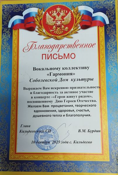 Соболевcкое авыл җирлегенең «Гармония» вокаль төркеме Килди авыл җирлегенең мәдәният йортында Ватан Геройлары көненә багышланган концертта катнашты. Коллективның якты һәм күңелле чыгышы төрле буын кешеләрен җыйган бәйрәм кичәсенең иң истәлекле мизгелләренең берсе булды.