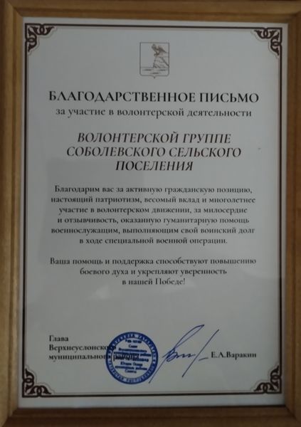 Район Башлыгы Е.А. Варакин районның волонтерлык төркемнәренә Рәхмәт хатлары тапшырды. Соболевское авыл җирлегенең волонтерлар төркеме аерым искә алынды.